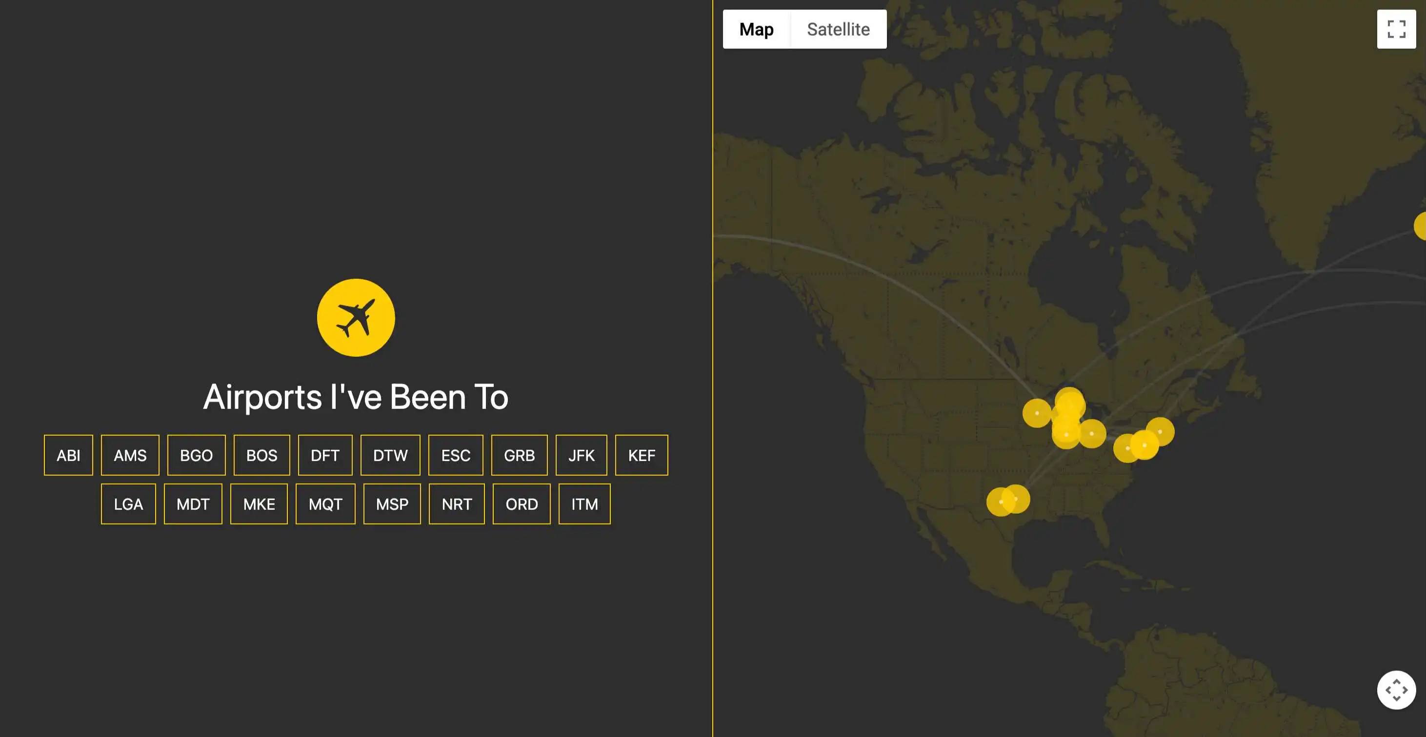 Interactive travel map showcasing airports visited and flight routes taken.