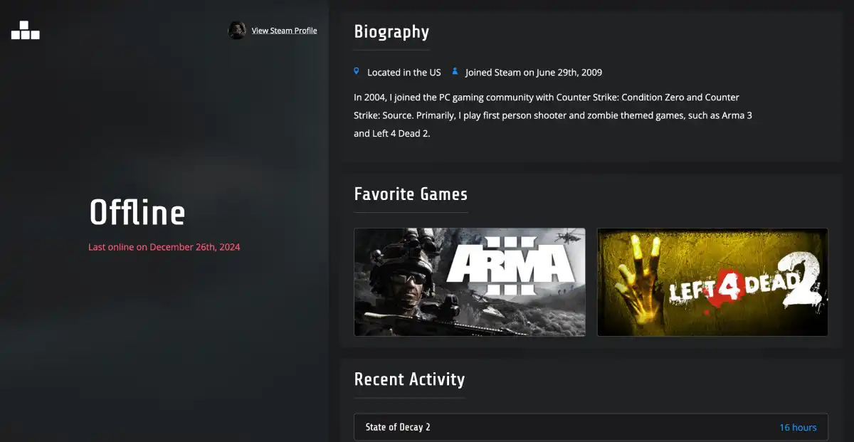 Single page website built with Astro and the Steam Web API to track user data.